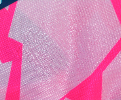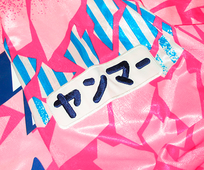 Jリーグ1年目のユニフォーム1st.。前年の後半よりスポンサーの位置、前後が入れ替わった。またJFL時代との違いは袖にJリーグワッペンが入ったこと。胸にエンブレムが入ったこと。そして生地にエンブレムの織り込みが入った。